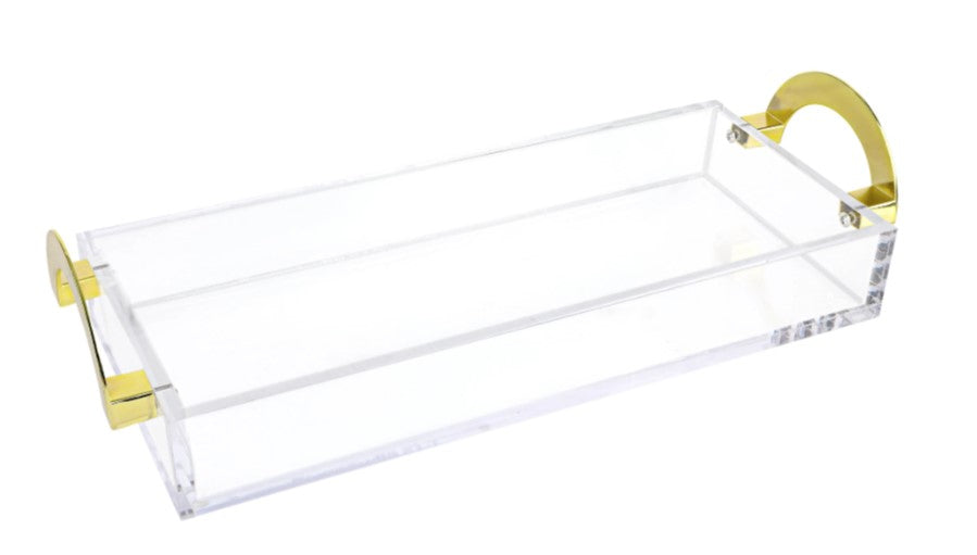 This stunning Luxe Lucite Bread Tray features thick crystal clear lucite, with modern circle gold or silver serving handles. Lends the perfect class to your table! Can be used as a bread tray, serving tray, or candy tray. Enjoy this stunner daily with its multiple uses.