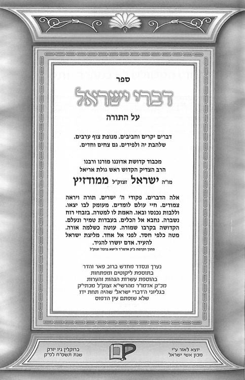 Beautiful Torah commentary by the great chassidic leader, Rabbi Yisrael Taub of Modzitz. He composed many melodies that are still sung by Chassidim and others today. Also included, his book Klalei Oraita. See Sample Pages