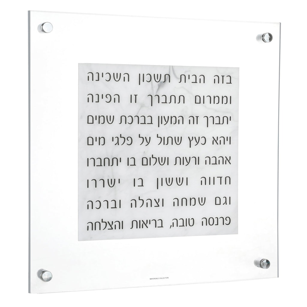 Beautifully sleek designed Floating Lucite Birchas Habayis printed on marble lucite, backed by ultra thick Lucite. Fresh. Modern.